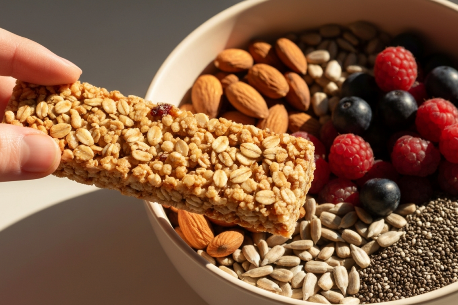 A close-up photorealistic image of a hand holding a supposedly healthy granola bar next to a bowl of fresh whole foods including nuts, seeds, and berries, with natural morning light highlighting the c
